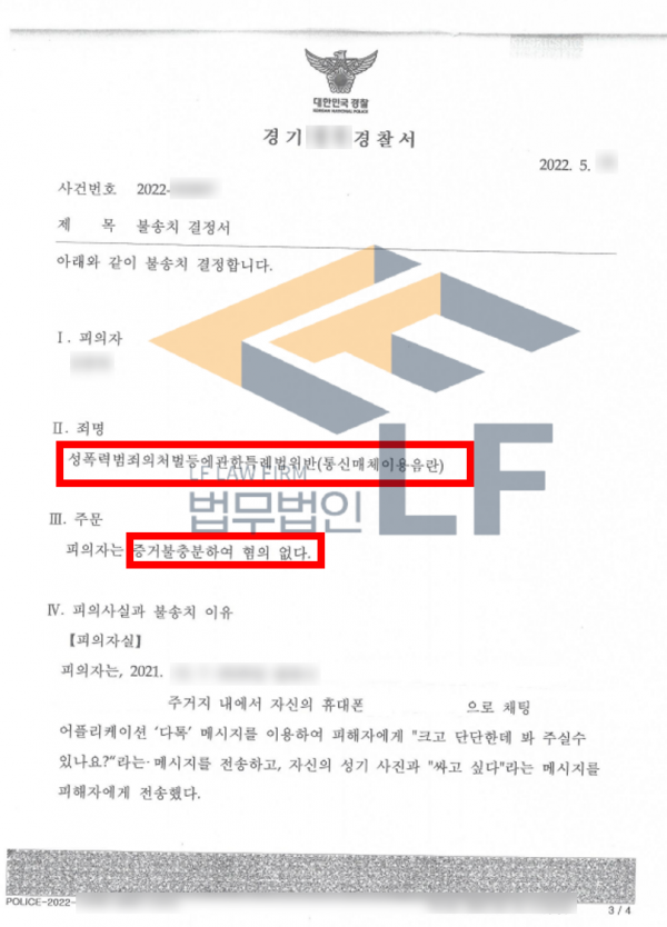 의뢰인과의 상담을 통해 고소된 사실관계를 면밀히 살펴보게 되었는데, 그 과정에서 고소인이 남자인 점 그리고 의뢰인과의 채팅 시 고소인이 자신을 여성으로 설정한 후 의뢰인에게 접근한 점을 확인할 수 있었습니다. 이에 변호인으로서 의뢰인과 경찰조사 준비를 통해 예상되는 질문 및 답변을 정리함과 동시에 변호인의견서를 작성하여 제출함으로써 합의금을 노린 악의적 고소임을 적극 주장하였습니다. 이후 의뢰인과 경찰조사에 동행하여 담당수사관과의 면담을 통한 변호활동을 통해 혐의없음 불송치 결정을 이끌어 낼 수 있었습니다.