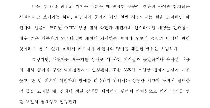 이러한 경우 법원에 게시글 삭제 및 금지 가처분을 구하여, 상대방의 금지 행위가 반복될 경우 금전적 배상책임을 부담하게 할 수 있습니다. 해당 사안에서 저는 인스타그램에 남을 비방하는 게시물을 올린 사람에 대하여 게시물 삭제 및 금지 가처분을 구하여 법원의 인용 결정을 받아내었습니다. 해당 게시물이 충분히 타인의 명예를 훼손하는 것이라는 점을 소명하였고, 법원은 이를 받아들였습니다. 이제 이 결정에 기초해서 상대방에 대해 형사처벌을 구하도록 할 예정입니다(상대는 글을 올릴 자유가 있지만 1건 당 100만 원씩 부담해야 합니다).