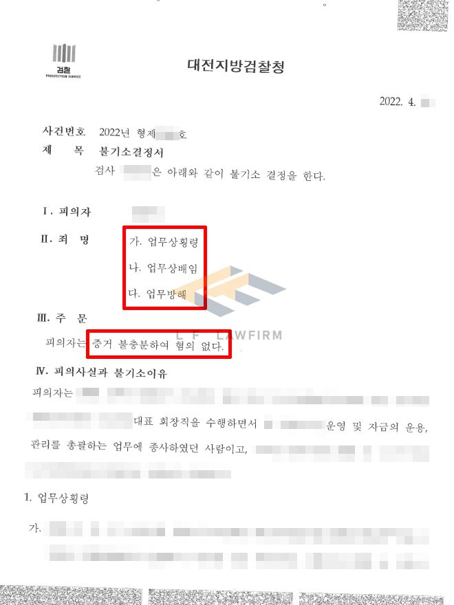 의뢰인은 아파트 입주자 대표회의 회장으로 재직하고 있던 중 자신이 관리하던 아파트 자금을 개인적으로 사용하였다는 혐의 등으로 새로운 아파트 입주자 대표자로부터 고소를 당하게 되었고 이에 업무상횡령, 업무상배임, 업무방해죄 혐의로 수사기관의 조사를 받게 되었습니다.