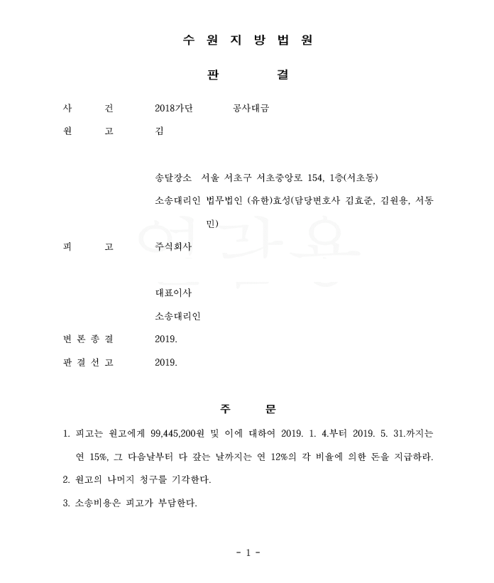 법원은 피고가 원고에게 공사대금을 지급하라는 판결을 선고하였습니다.