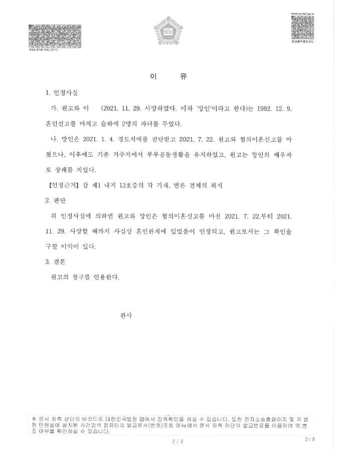 의뢰인은 망인과 오랜 기간 동안 법적 부부였으나 망인이 사망하기 직전 이혼을 하였습니다. 그러나 의뢰인은 이혼을 하였음에도 망인이 사망할 때까지 한 집에 살면서 망인을 간호하는 등 사실혼관계를 유지하였고 망인 사망 후 위 기간 동안 사실혼관계를 인정받을 필요가 있어 저를 찾아와 의뢰하였습니다.
