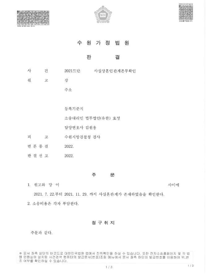 저는 즉각 법원에 사실혼관계존부확인의 소를 제기하여 위와 같은 사정을 주장 입증하여 법원은 승소 판결을 선고하였습니다.