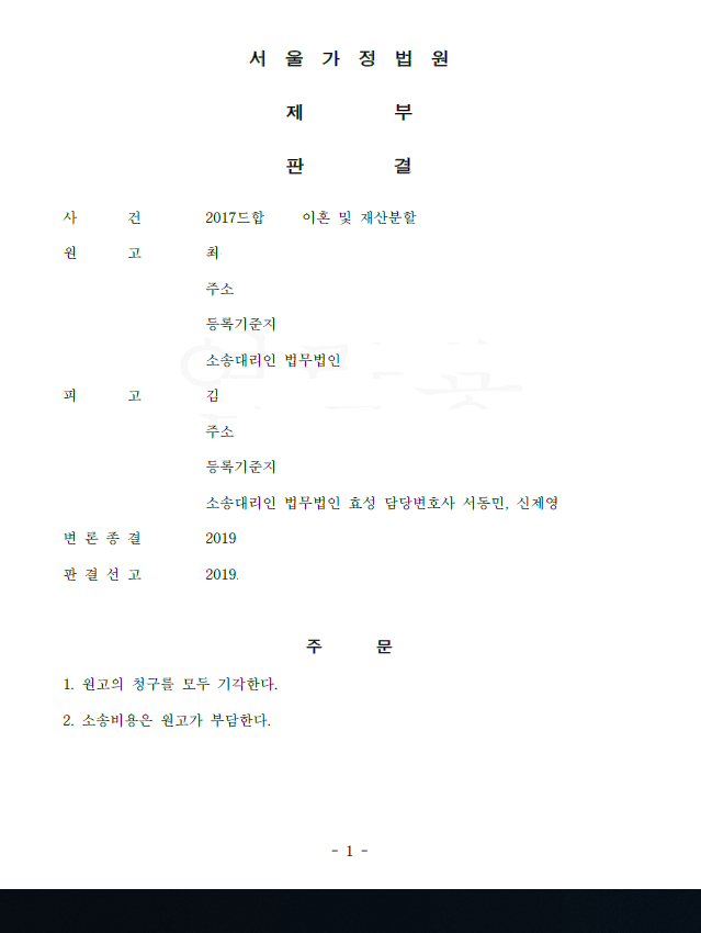 이에 저는 즉각 답변서 및 준비서면을 제출하면서 응소하였고 원고의 유책성을 조목조목 주장 입증하였습니다. 이에 법원은 원고의 이혼 및 재산분할 청구 모두를 기각하였습니다.