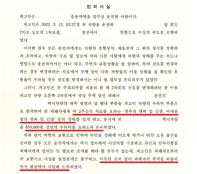 A씨는 2022. 3. 13. 03:37경 중요한 미팅을 마치고 귀가하던 중 피해자 B씨의 택시 차량을 충격하였습니다. 이로 인하여 B씨에게 약 2주간의 치료를 요하는 상해를 입힘과 동시에 B씨의 차량을 650,000원 상당의 수리비를 요하는 손괴를 하였는데, 그럼에도 A씨는 너무나 겁을 먹은 나머지 자신을 뒤쫓아오는 B씨와 이후 B씨의 신고로 출동한 경찰의 추적을 따돌리며 도주하였습니다.