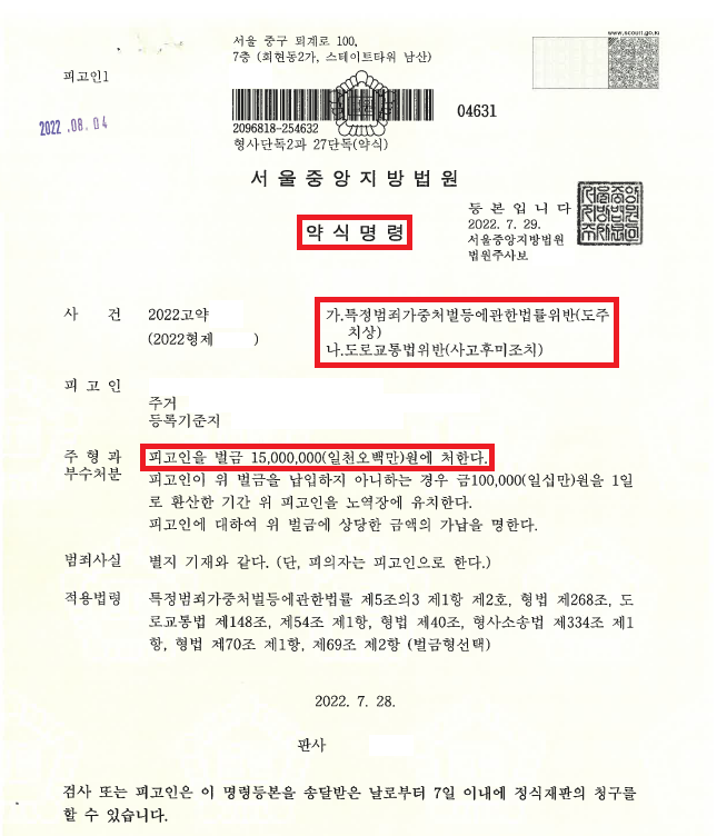 이러한 저의 조력을 바탕으로 A씨는 피해자와 경찰의 추적을 따돌리며 뺑소니를 저질러 죄질이 매우 좋지 않았을 뿐만 아니라 음주운전으로 강한 의심까지 받아 강한 처벌을 피하기 어려운 상황이었음에도 불구하고 약식명령으로 벌금형을 선고받음으로써 재판까지 나아가지 않고 사건을 최대한 가볍게 마무리할 수 있었습니다.