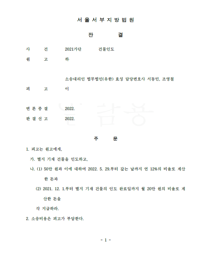 저는 즉각 명도소송을 제기하여 승소 확정 후 강제집행으로 피고를 퇴거시키고 짐을 다 들어내어 의뢰인은 건물을 명도받았고 임료 상당의 부당이득반환까지 받았습니다.