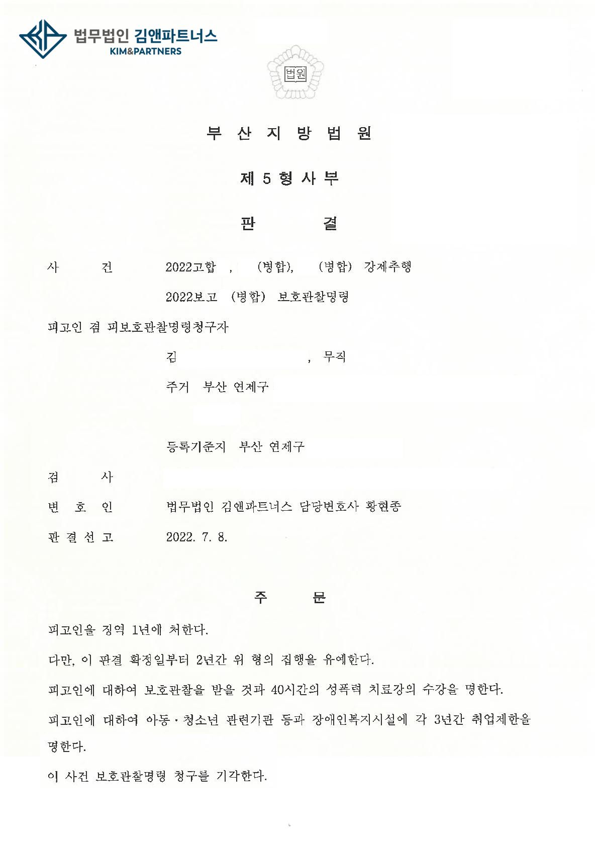 의뢰인은 황변호사의 변론으로 피해자와 합의가 없고 진정서를 제출받은 상황에서 다행이 집행유예를 선고받아 사회에서 일할 수 있게 되었습니다