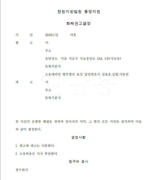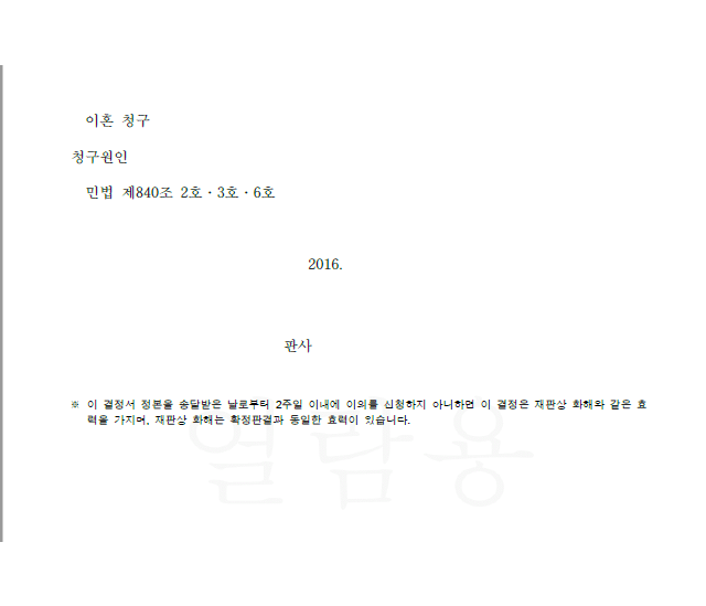 저는 즉각 재판상 이혼 청구를 하면서 재판상 이혼 사유 및 그로 인하여 혼인 관계가 실질적으로 파탄났음을 주장 입증하였고 법원은 저희의 주장을 모두 받아들여 원피고가 이혼하라는 화해권고결정을 내려 그대로 확정되었습니다.