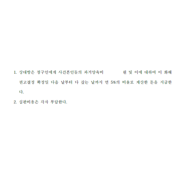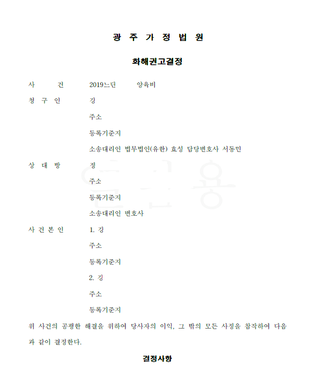 이에 저는 즉시 상대방을 피고로 하여 과거양육비청구소송을 제기하였고 전체적인 사건의 경위, 의뢰인이 혼자 양육하게 된 경위, 구체적인 양육비 액수 등을 적극적으로 주장 입증하였습니다. 이에 법원은 피고가 원고에게 과거 양육비를 지급하라고 화해권고결정을 내렸고 그대로 확정되었습니다.