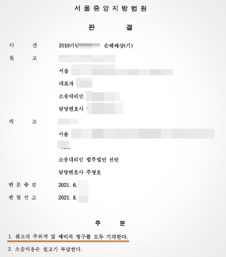1심 법원은 피고 변호사인 본 변호사의 주장, 입증을 모두 받아 들여 원고 청구 기각(피고 전부 승소) 판결을 내렸습니다.
