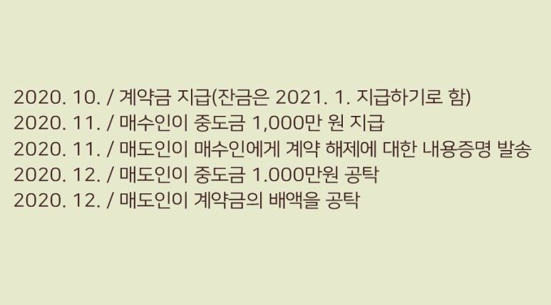 즉 중도금 지급을 한 경우라면 이행에 착수한 것으로 보고 이행의 착수 이후에는 일방적으로 계약 해제를 주장할 수 없게 되는 것입니다. 이는 중도금 지급 날짜와는 무관하다고 할 수 있습니다.