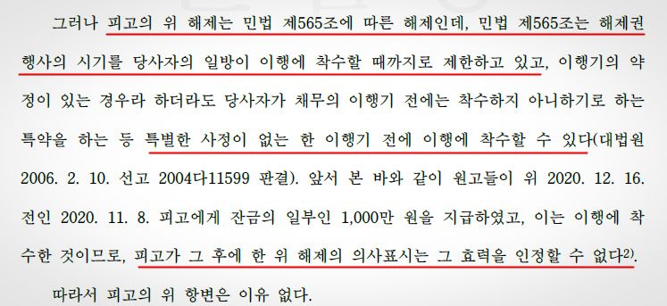 법원은 피고(매도인)의 해제는 민법 제565조에 따른 해제이고, 위 해제권은 당사자의 일방이 이행에 착수할 때까지로 제한되고 있다고 하면서, 원고(매수인)가 이미 잔금의 일부인 1.000만 원을 지급하였는바, 피고(매도인)의 해제는 그 효력을 인정할 수 없다고 판결하였습니다.