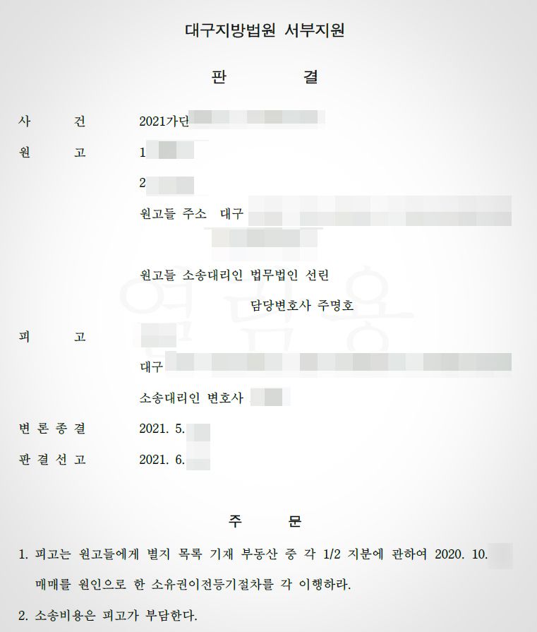 이에 피고는 원고에게 소유권이전등기를 해 줄 의무가 있다고 전부 승소 판결을 받았습니다. 아래의 판결문을 보시면 피고는 원고들에게 별지 목록 기재 부동산 중 각 1/2지분에 관하여 2020.10.00 매매를 원인으로 한 소유권이전등기절차를 각 이행하라고 되어 있습니다.