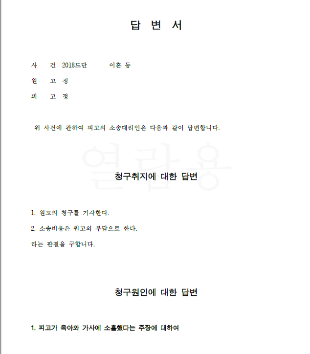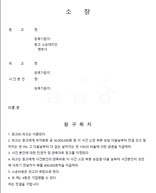 의뢰인은 남편과의 사이에 아이 한 명을 두고 가사와 양육에 최선을 다하고 있었는데 성격 차이 등으로 여러 모로 충돌하던 남편이 갑자기 의뢰인을 상대로 재판상 이혼 청구를 하면서 의뢰인이 가사와 양육에 소홀하고 부정행위를 저질렀으며 자신에게 심히 부당한 대우를 했다고 주장하면서 위자료를 청구하고 아이의 앙육권은 자신이 가지며 의뢰인이 양육비를 지급해야 한다고 주장하였습니다.