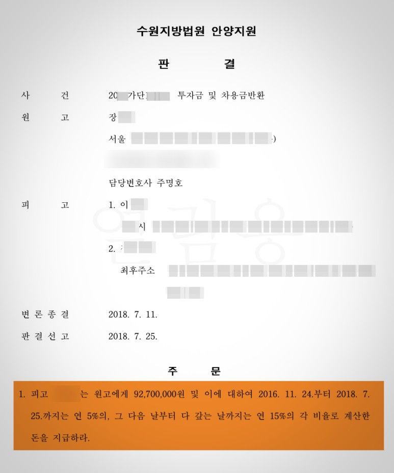 이처럼 대여금과 투자금은 그 법적 성질이 달라 실제 소송에 있어서는 원고는 대여금이라고 주장하고 피고는 투자금이라고 주장하여 그 판단이 쉽지 않았습니다. 따라서 타인에게 금전을 빌려줄 경우에는 명확히 그 법적 성격을 정해서 계약서를 작성해야 합니다. 그럼 제가 승소한 아래의 사례를 한번 보겠습니다.