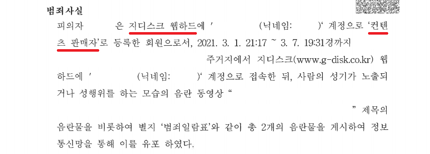 A씨는 '지드스크' 웹하드에서 '컨텐츠 판매자'로 활동하며 2021. 3. 1.부터 2021. 3. 7.까지 총 2회에 걸쳐 음란물을 게시하여 유포하였습니다.