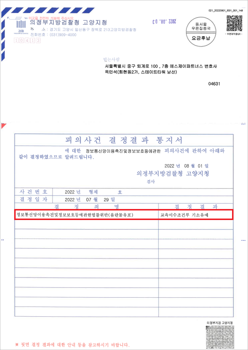 이러한 저의 조력을 바탕으로 A씨는 '기소유예' 처분을 받음으로써 성범죄 전과자가 될 위기에서 벗어날 수 있었습니다.