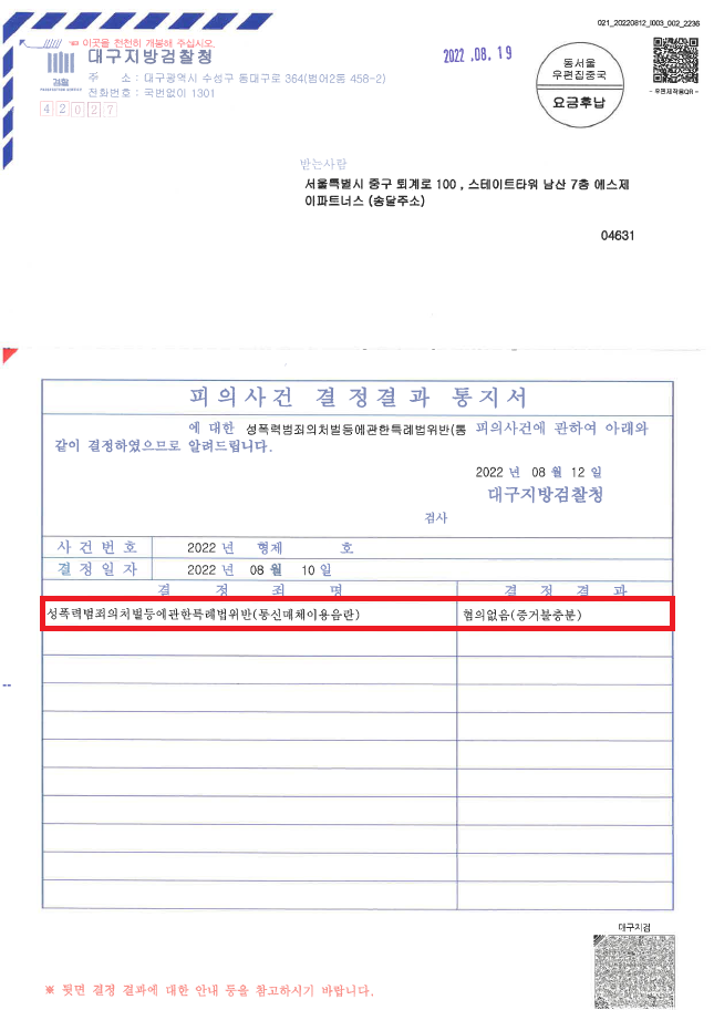 이러한 저의 조력을 바탕으로 A씨는 전혀 모르는 여성에게 다짜고짜 성기 사진을 전송하였을 뿐만 아니라 초기 대응에도 실패하였음에도 불구하고 검찰로부터 '혐의없음(증거불충분)' 처분을 받음으로써 성범죄자가 될 위기에서 벗어날 수 있었습니다.