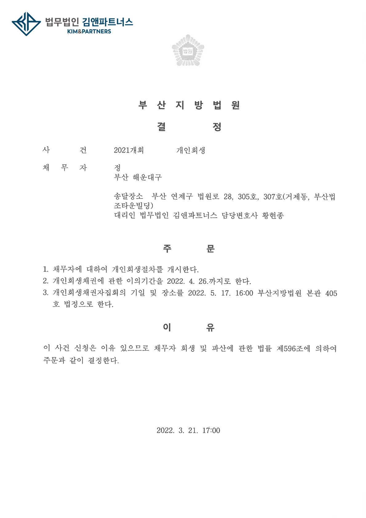황변호사는 최근 부산지방법원에서 개인회생을 의뢰한 의뢰인에 대한 개시결정을 받았습니다.