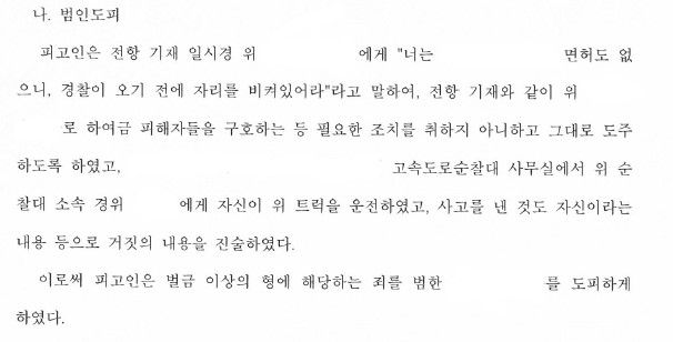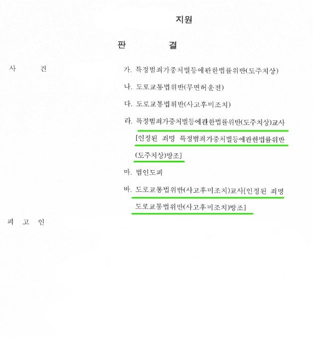 또한 검사는 뺑소니 교사죄로 기소를 하였으나 이에 대하여 본 변호인은 뺑소니 '교사죄'는 성립할 수 없다는 취지로 변론, 공판검사는 단순 뺑소니 '방조죄'로 공소사실을 변경하기도 하였습니다(아래 판결문의 '인정된 죄명' 부분을 참고하시면 됩니다).