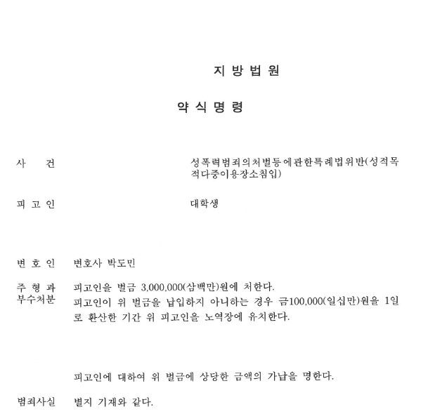 의뢰인에 대하여 벌금 300만 원의 약식기소가 이루어졌고, 판사도 약식명령을 내려 사건이 종결되었습니다.