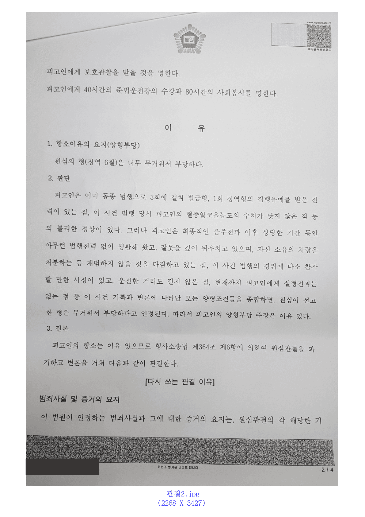 2진아웃 등, 음주운전 처벌이 날이 갈수록 강화되는 현 시점에서 이 사건의 5번째의 음주운전은 실형을 피하기 어려운 상황이었고 1심에서 6월의 형을 선고받을 수밖에 없었습니다. 그러나 항소심에서 의뢰인의 변호인은 의뢰인이 범죄사실을 전부 인정하고 잘못을 깊이 뉘우치고 있는 점, 의뢰인 소유의 차량을 매각하여 처분한 점 등 양형부당을 이유로 변론하였고 의뢰인에게 유리한 양형사유를 최대한 수집하여 제출하여 1심의 징역 6월의 실형이 집행유예로 감형될 수 있었습니다.