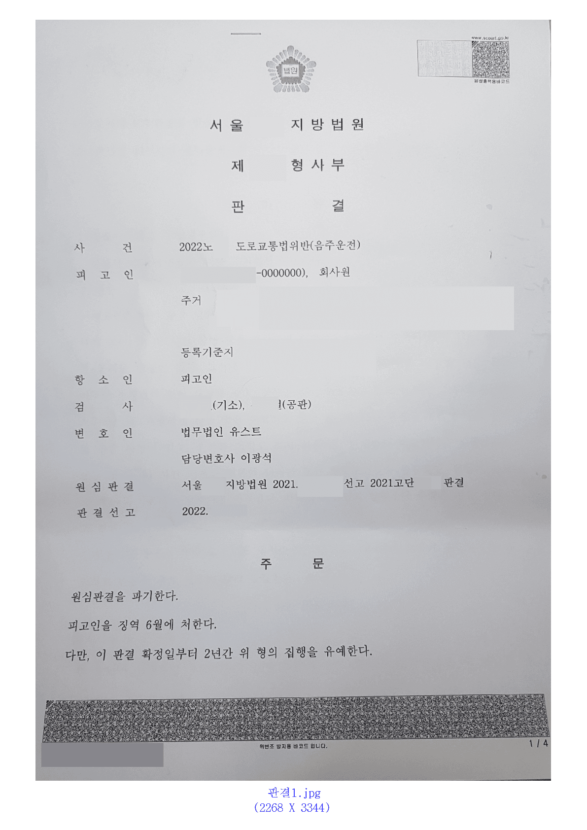 의뢰인은 지인들과 음식점에서 식사를 하며 술을 마신 후, 식당 주차장에서 의뢰인의 차량을 다른 곳으로 이동해야 해서 이동주차를 이유로 150미터 정도 운행하던 도중 음주단속에 적발되었고, 단속 당시 혈중알콜농도는 0.08% 이상이었습니다. 의뢰인은 이미 음주운전으로 3회에 걸쳐 벌금형, 1회 징역형의 집행유예를 받은 전력이 있었으며, 혈중알코올농도의 수치가 낮지 않아 불리한 정상이 있어 1심에서 징역 6월의 형을 선고받았습니다.