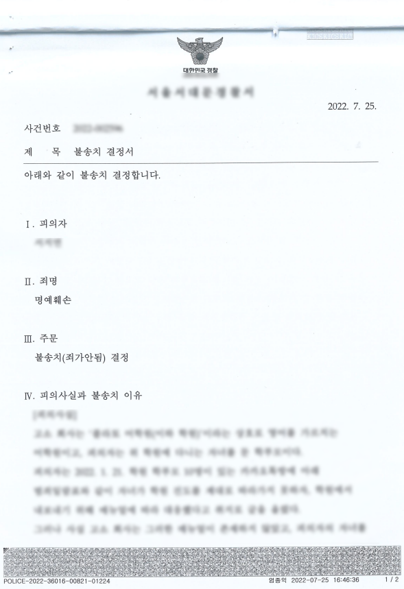 따라 대응했다는 취지로 글을 올렸습니다. 그러나 사실 고소인은 그러한 메뉴얼이
