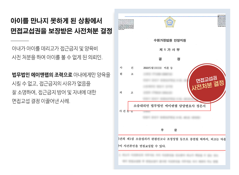 이러한 근거를 기반으로 아이를 아내에게만 양육시킬 수 없는 점, 접근금지를 할 사유가 없음을 소명하였고 임시로 양육권이 아내에게 부여되는 결정 및 접근금지 결정을 방어해 내고, 정기적으로 면접교섭을 하여 아이를 만날 수 있는 결정을 받아내었습니다. 변호사들의 적극적인 주장 덕분에 의뢰인은 자녀를 정기적으로 볼 수 있게 되었던 사례입니다.