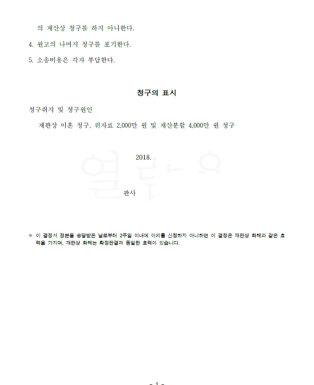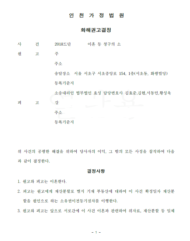 저는 즉각 재판상 이혼 청구를 제기하면서 상대방의 부당한 행위 등 이혼사유를 주장 입증하였고 재산분할로 상대방 명의로 된 아파트의 이전등기청구를 구하였습니다. 법원은 저희의 주장을 모두 받아들인 화해권고결정을 하였고 원피고 이의 없이 그대로 확정되었습니다.