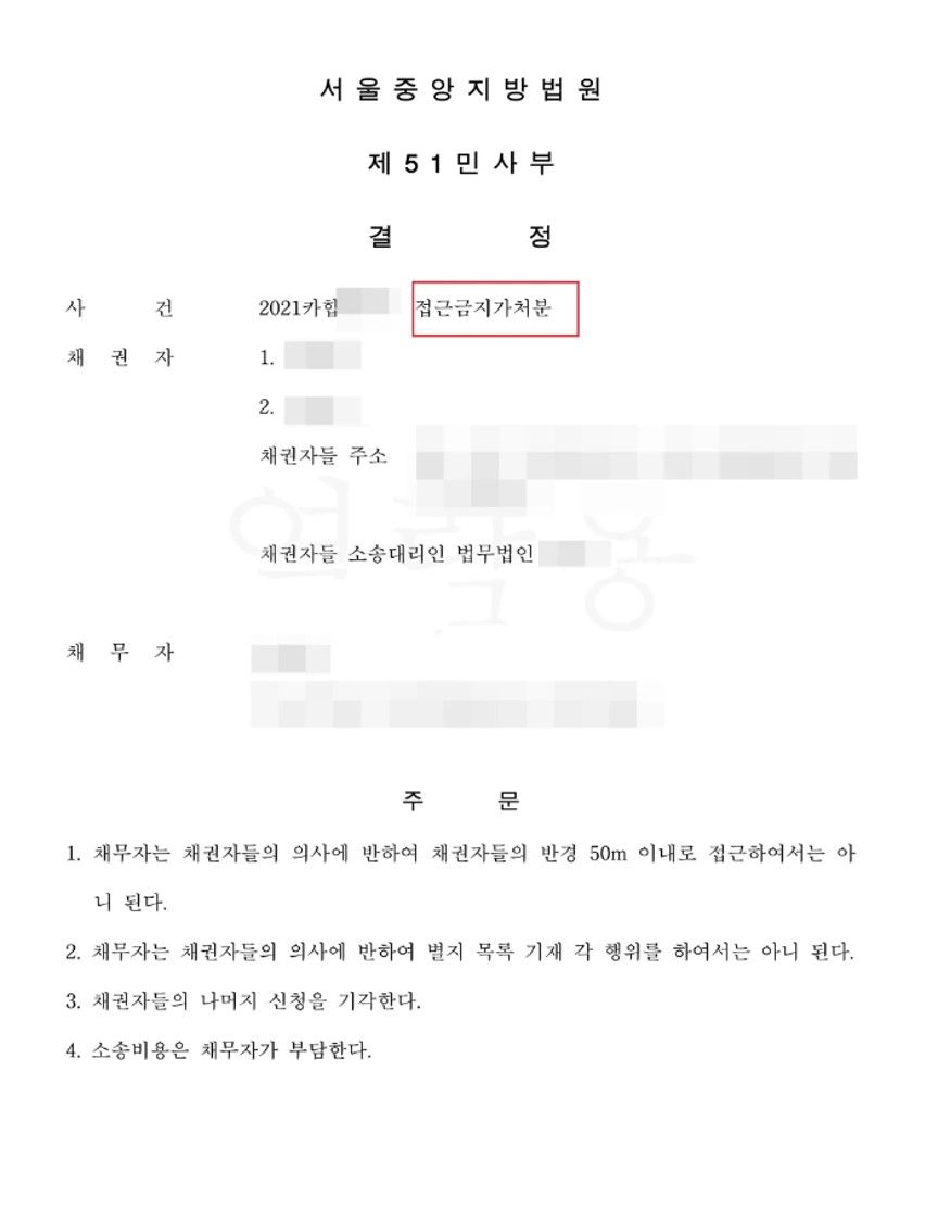 그래서 의뢰인들의 의사에 반하여 반경 50m 이내로 접근해서는 안된다는 판결을 받아낼 수 있었습니다.