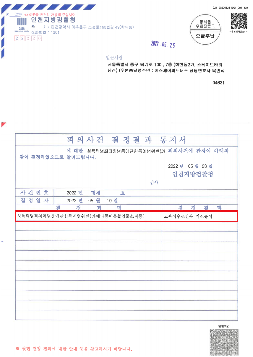 이러한 저의 조력을 바탕으로 A씨는 최근 '윤XXX'의 '돈XXX' 불법 촬영물 사건에 대해 매우 강하게 처벌하고 있음에도 불구하고 '기소유예' 처분을 받음으로써 성범죄 전과자가 될 위기에서 벗어날 수 있었습니다.