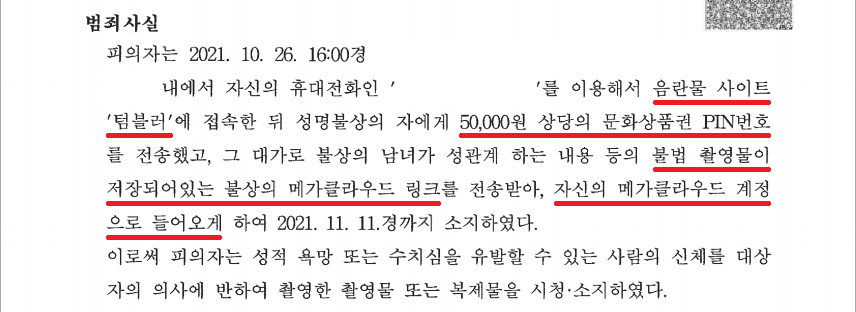 A씨는 음란물 사이트 '텀블러'에서 알게 된 음란물 판매자 B씨에게 50,000원 상당의 문화상품권 PIN 번호를 전송하고 B씨로부터 '윤XXX'가 촬영하여 유포한 '돈XXX' 불법 촬영물이 포함된 음란물이 저장되어 있는 메가클라우드 계정으로 연결되는 링크를 전송받았습니다.