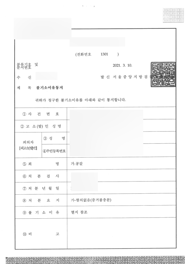 달리 피의사실을 인정할 만한 증거를 발견할 수 없어 증거 불충분하여 혐의 없음.