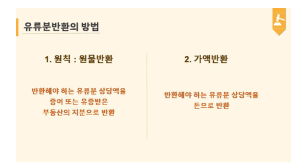 가액으로 할 경우에는 약간 금액이 낮아지기도 합니다. 왜냐하면 아파트 지분으로 반환을 받아서 등기를 하고 나중에 팔아서 매매대금을 서로 나눠 갖기 위해서는 등기비용이나 양도소득세 등 기타 비용이 지출될 수 있으므로, 가액으로 반환받을 때는 그러한 예상 비용을 뺀 금액을 돈으로 받게 되는 것입니다.