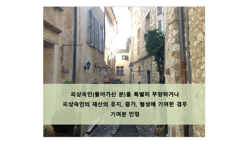 민법은 피상속인(돌아가신 분)과 상당한 기간동안 동거하고 간호하는 등의 방법으로 특별히 부양을 하거나 피상속인의 재산의 유지 또는 증가, 형성에 특별히 기여를 한 경우에 기여분을 인정하고 있으며, 대법원도 배우자의 경우에는 기여분을 비교적 수월하게 인정하고 있습니다.