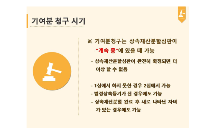 다만, 기여분청구는 처음부터 하지 않는다고 하더라도 늦어도 상속재산분할심판이 계속 중에 있을 때에야 청구가 가능합니다. 따라서 상속재산분할심판이 완전히 확정되면 더 이상 기여분 청구를 하실 수 없습니다. 즉 1심에서 하지 못하셨다고 하더라도 항소한 경우 완전히 확정된 것이 아니기 때문에 2심에서 할 수 있습니다. 그리고 법정상속등기가 된 경우에도 기여분청구를 별도로 할 수 있습니다. 상속재산분할이 이미 완료된 이후에 새로 나타난 자녀가 있어서 이 사람이 다른 상속인들을 상대로 상속분가액청구를 할 때에도 기여분청구를 별도로 할 수 있습니다. 늦은 것이 아닙니다.