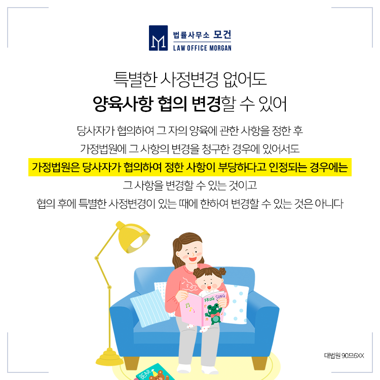 법률사무소 모건의 이다슬 대표 변호사는 협의이혼 당시 양육비를 포기하였으나, 거의 3년 만에 이를 번복하고 다시 양육비를 청구하고자 하셨던 의뢰인의 사건을 맡아 양육비를 인정받은 성공사례를 보유하고 있습니다. 의뢰인의 입장에서 사건을 바라보고 자녀의 건강한 성장과 복리를 위해 최선을 다하고 있으니 목동, 종로, 마포 등 이혼전문변호사를 찾고 계신 분들은 법률사무소 모건으로 문의하세요.