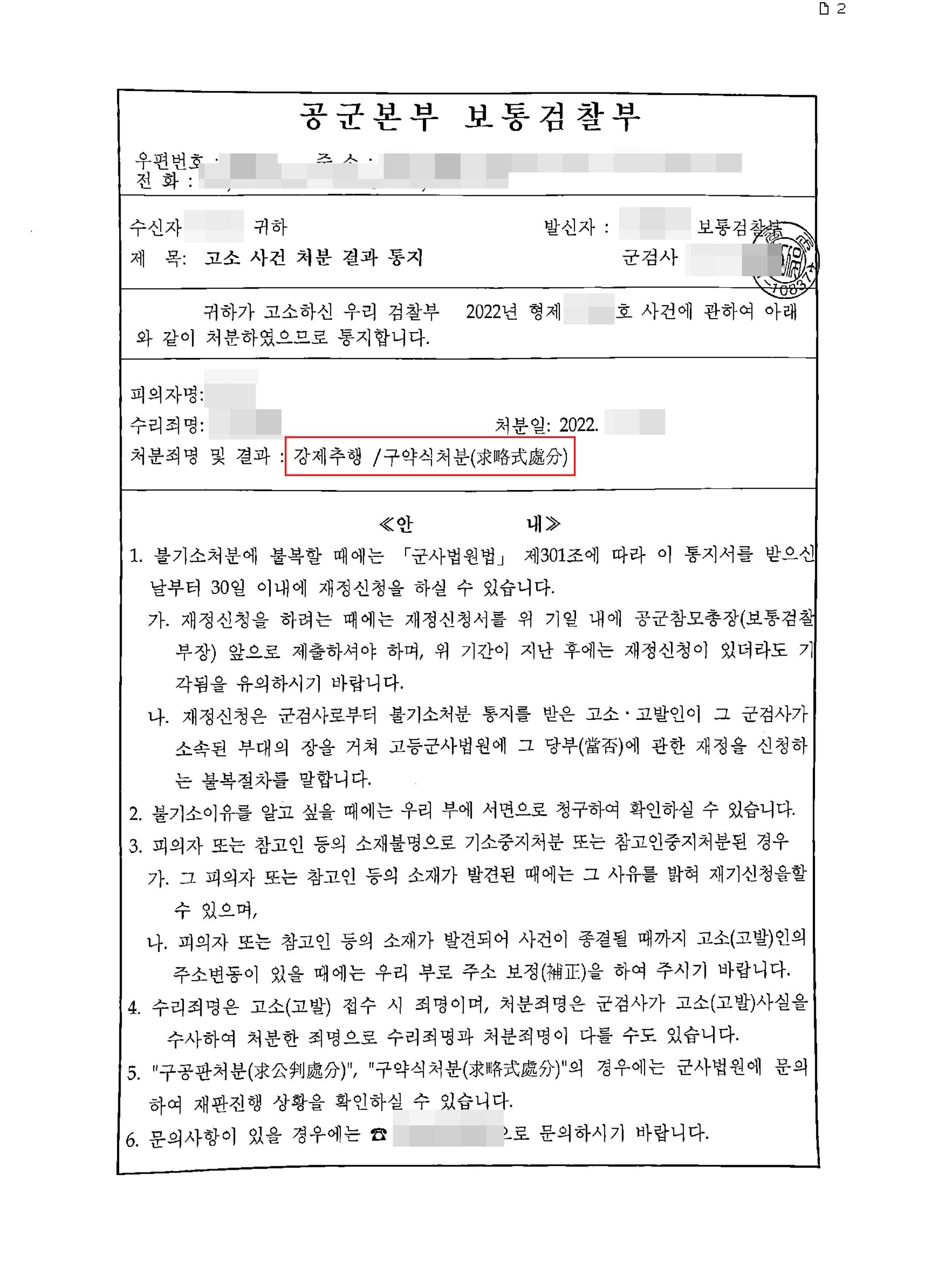 이러한 본 변호인의 변론에 힘입어, 군검찰은 가해자의 혐의를 인정하여 가해자에게 구약식처분을 내렸습니다.