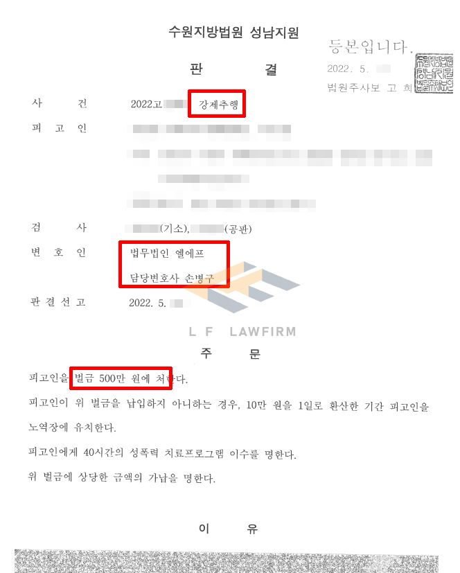 변호인으로서 의뢰인과 오랜 시간 상담을 하였는데, 의뢰인은 자신의 혐의를 일단 인정하고 반성하고 있는 상황으로서 직장 등의 사정으로 인하여 실형만을 면하길 간절히 원하는 상황이었습니다. 이에 저는 변호인으로서 의뢰인에게 유리한 양형자료들을 수집하여 변호인의견서를 제출하였고, 피해자의 극심한 거부로 인하여 피해자와 합의에 이르지는 못하였으나, 의뢰인이 벌금을 받아야만 하는 이유를 적극적으로 변론하게 되었습니다.