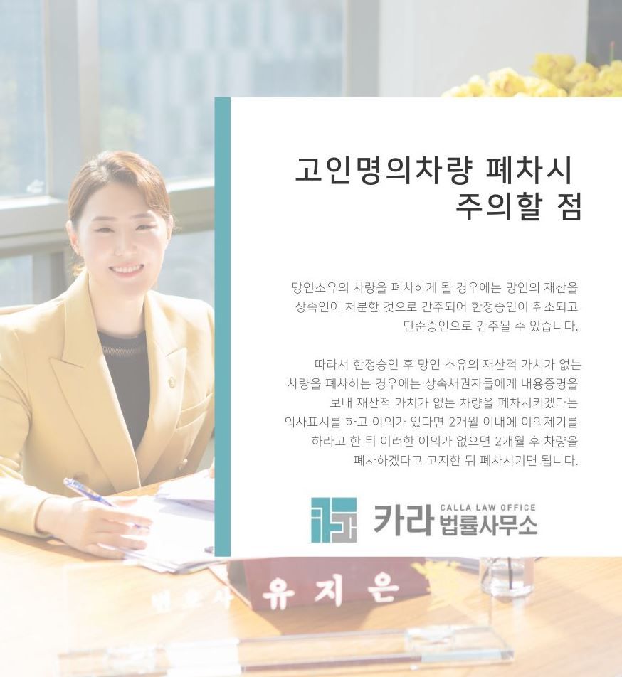 망인소유의 차량을 폐차하게 될 경우에는 망인의 재산을 상속인이 처분한 것으로 간주되어 한정승인이 취소되고 단순승인으로 간주되기 때문입니다.