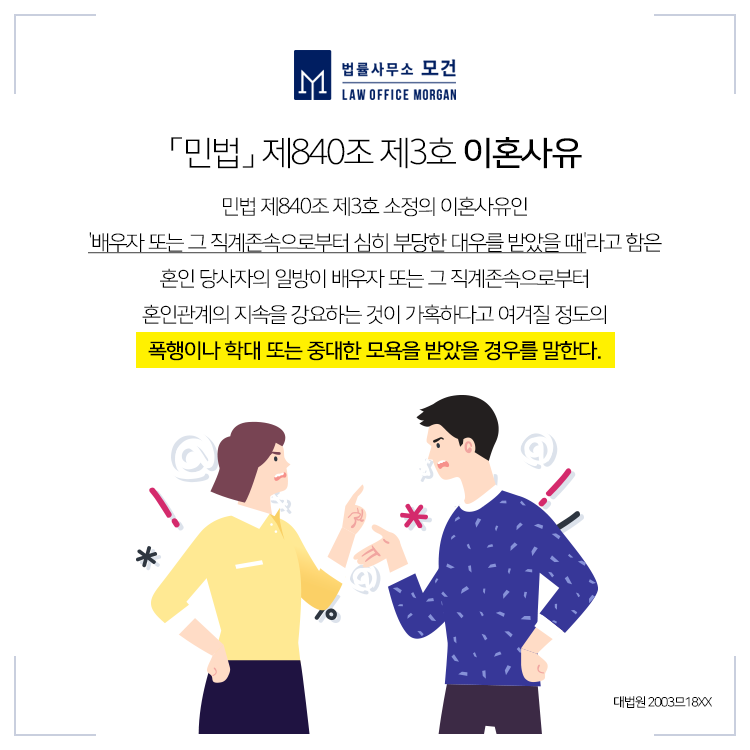 「민법」 제840조에서 정한 이혼사유에서 '고부갈등'으로 인한 이혼이 받아들여지기 위해서는 제3호 '배우자 또는 그 직계존속으로부터 심히 부당한 대우를 받았을 때', 제6호 '기타 혼인을 계속하기 어려운 중대한 사유가 있을 때' 에 해당됨을 입증하여야 합니다.