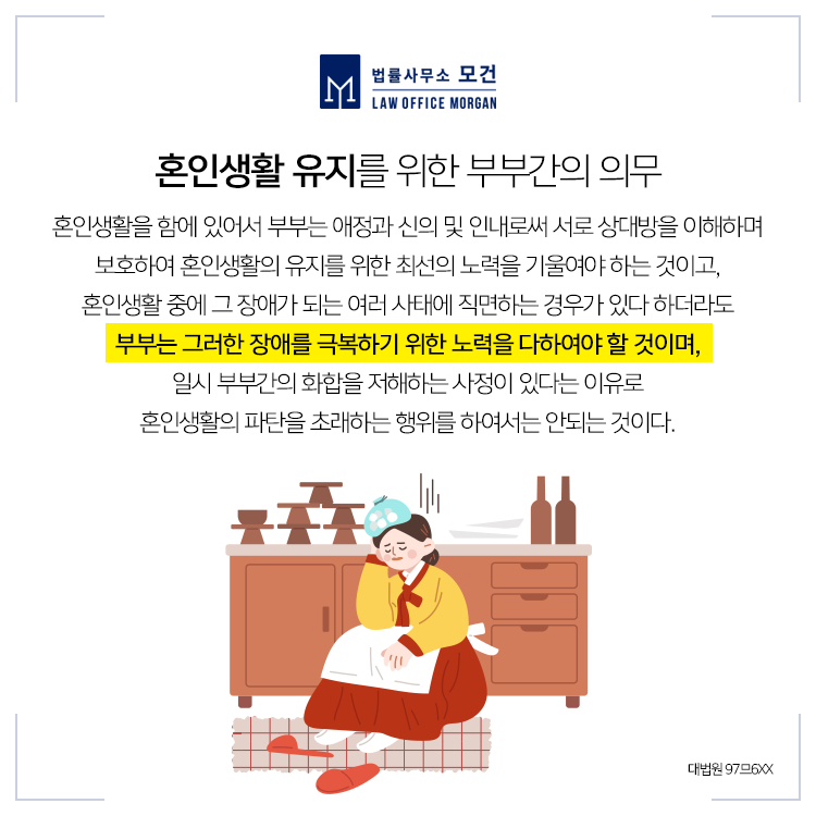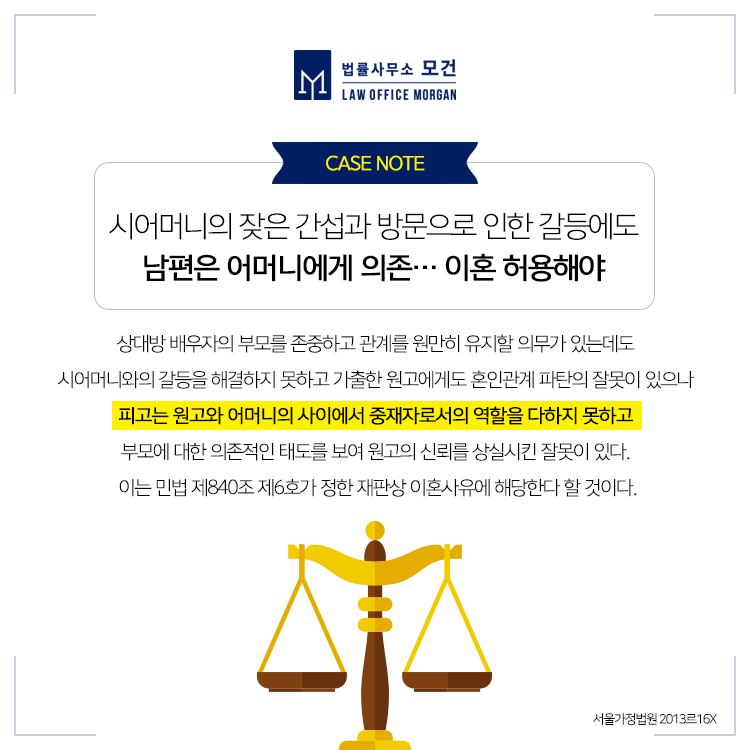 특히 명절이 다가오면 시댁스트레스가 높아지고 부부간 갈등 역시 잦아지면서 이혼을 고민하거나 결심하는 분들이 많습니다. 이때 시댁, 시어머니와의 갈등이 부부갈등의 시발점이라 하더라도, 법원은 부부가 그러한 갈등 속에서도 남편은 아내를 이해하고 갈등을 중재하며, 아내는 갈등해소에 노력을 기울였는지를 살펴보고 이혼을 결정하기 때문에 간혹 두 사람의 혼인관계가 회복횔 수 없을 정도로 악화되었거나 파탄되었다고 보여지지 않는 경우에는 이혼청구는 받아들여지지 않을 수도 있습니다.