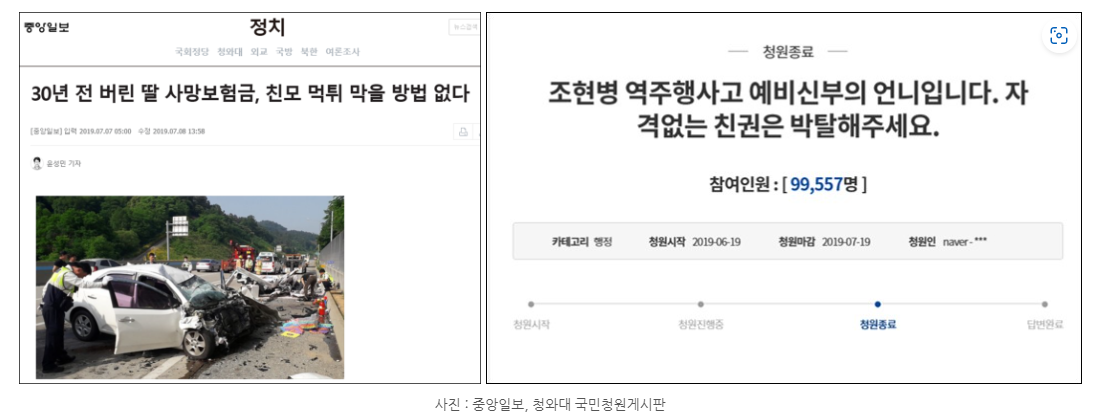 그런데 그 이후에 문제되었던 것은 A씨의 친모였습니다. A씨의 언니는 청와대 국민청원게시판에 글을 올렸습니다. "A씨의 친모는 A씨가 한 살 때 친부와 이혼을 하여 떠난 후 A씨는 고모와 고모부 손에서 자랐는데, A씨가 사망하자 친모가 30년 만에 나타나서 보험회사를 돌아다니면서 A씨에 대한 사망보험금을 청구하고 있으니, 친모의 자격없는 친권을 박탈"하여 상속권을 행사하지 못하게 해달라는 내용이었습니다.