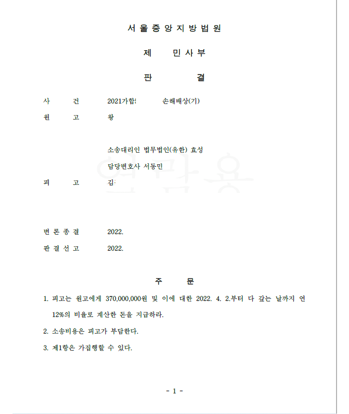 저는 즉각 피고를 상대로 민사소송 손해배상청구를 하여 승소 확정되어 의뢰인은 피해액을 반환받게 되었습니다.
