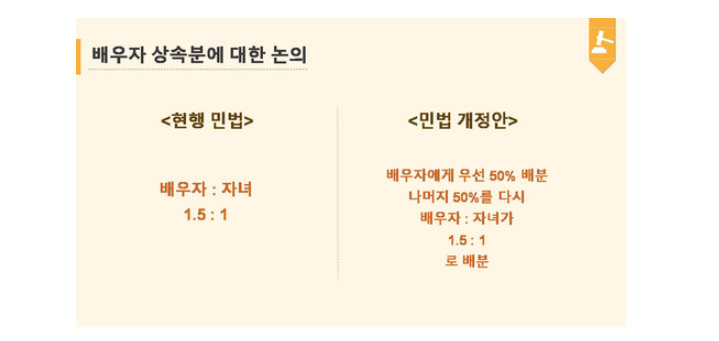 개정안의 내용은 상속재산의 50%를 배우자에게 우선 배분하는 것입니다.