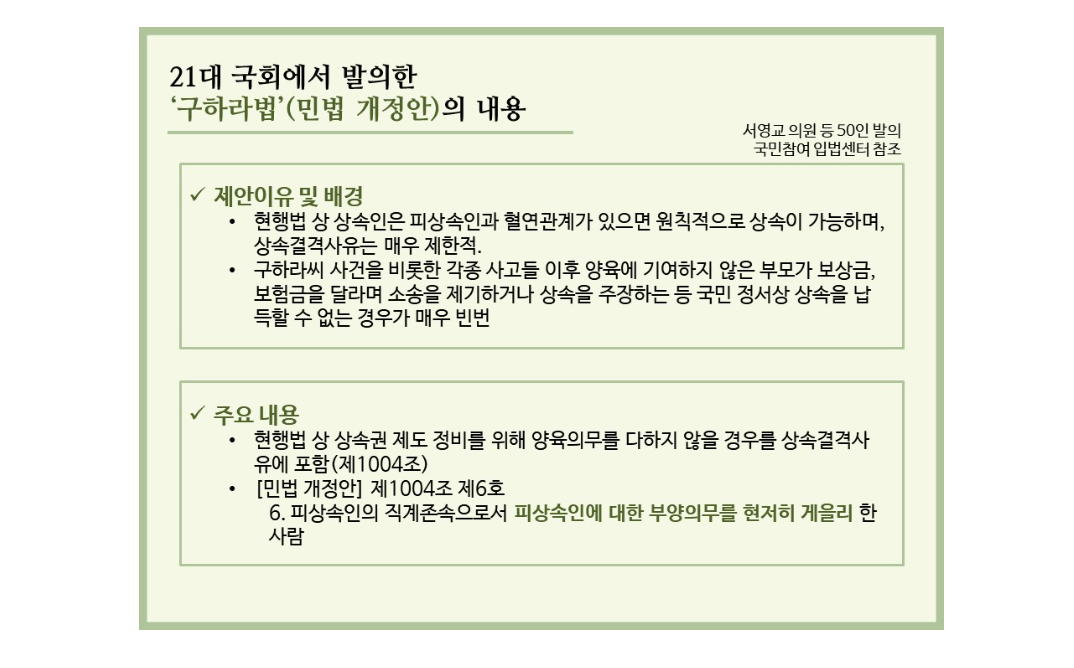 이번에도 구하라씨의 오빠가 ① 민법 제1004조의 상속결격사유에 ‘직계존속 또는 직계비속에 대한 보호•부양의무를 현저히 게을리 한 자’를 추가하고, ② 상속권을 갖는 부모 한 쪽의 기여도를 인정해 양육 책임을 해태한 다른 부모의 상속권을 제한하는 취지의 민법 개정안(‘구하라 법’)을 입법 청원하였습니다. 또한 제21대 국회에서도 서영교 의원 등 50인이 양육의무를 다하지 않을 경우를 상속결격사유에 포함시키는 것을 내용으로 하는 민법 개정안을 발의하였습니다.