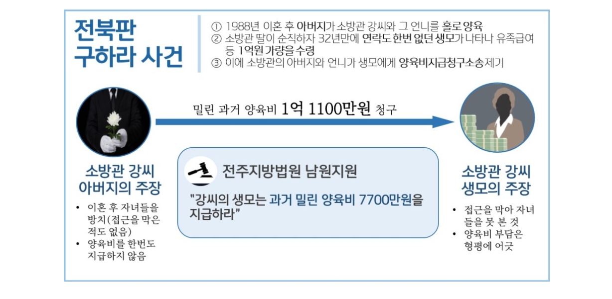 소방관인 딸이 순직하자 이혼 후 생전 연락도 없던 친모가 딸의 퇴직금과 유족급여를 챙겨간 일명 ‘전북판 구하라 사건’이 발생했습니다. 이에 아버지와 친언니는 딸의 장례식조차 참석하지 않았던 친모가 파렴치하게 돈을 받아갔다며 친모를 상대로 양육비 청구 소송을 제기하였고, 법원은 친모에게 그동안 밀린 양육비 총 7700만원을 지급하라고 판결하였습니다.