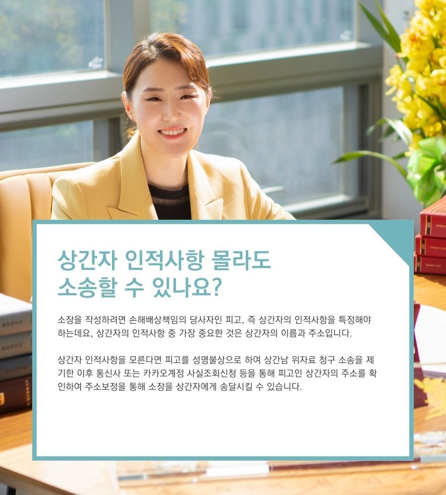 이런 경우 변호사사무실에서는 피고를 성명불상으로 하여 상간남 위자료 청구 소송을 제기한 이후 통신사 또는 카카오계정 사실조회신청 등을 통해 피고인 상간자의 주소를 확인하여 주소보정을 통해 소장을 상간자에게 송달시킬 수 있습니다. 만일 소송 진행절차를 앞당기고 싶다면 변호사사무실을 찾기 전 상간자의 인적사항을 파악하는데 집중해 주소를 파악할 수 있는 자료들을 미리 준비해두는 것이 좋습니다.