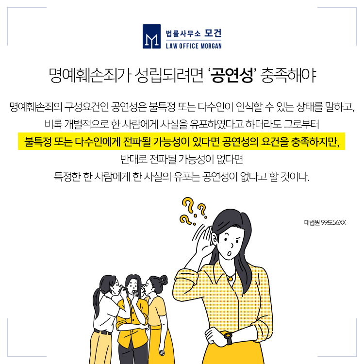 재판부는 당시 친정부모가 A씨의 직상상사를 만나 부정행위를 알린 것은 회사 내 직위와 A씨와의 관계를 살펴볼 때 불특정 다수인에게 전파할 가능성이 있었다고 보기 어려워 명예훼손이라 볼 수 없으나, 친정부모가 회사 로비에서 직원들에게 부정행위 사실을 알리고, A씨의 집 임대인에게 부정행위를 알린 사실은 명예훼손에 해당된다고 보았습니다.